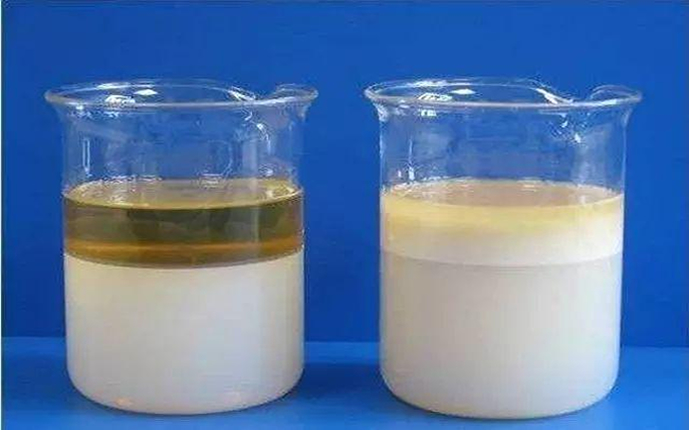 润滑油在静止状态下,因油水界面处有一层水化膜,界面张力比较低,体系界面面积不大,从而形成一种比较稳定的微乳化状态,这时油和水是分层的,且界限很明显,密度大的水在底层,油在上层,这时油品处于微乳化状态。但随着时间的增长,油水界面处远离亲水基处的水化膜因发生滑动和交换,导致水化膜慢慢的模糊起来,润滑油开始乳化,突出的表现就是靠近隔离层的润滑油的透明度降低,明显有点浑浊,泛白,中间夹杂着一些乳白色胶乳状物,润滑油进入到了初乳化阶段。