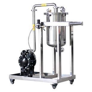 移动式袋式过滤器包括了一个不锈钢袋式过滤器、气动隔膜泵、气源二联件、单气控阀,装置在手推车上,可随意移动至任何生产线上进行工作。袋式过滤系统是一种新型的过滤系统,过滤机内部由金属网篮支撑滤袋,流体由入口流进,经滤袋过滤后从出口流出,杂质被拦截在滤袋中,更换滤袋后继续使用。主要用于过滤产品的杂质,带压力监测表,当压力过大提醒更换滤袋。