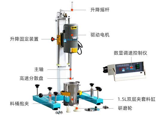 设备带有锁紧及升降手柄,能够快速升降和固定;分散盘采用内六角螺栓与主轴固定,能够方便快速拆卸更换,清洗容易;带有夹桶装置,可以快速将搅拌桶固定,防止桶在工作中发生位移造成安全事故。