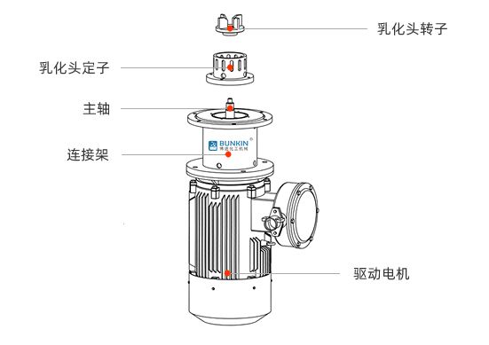 在马达的驱动下,高速旋转的转子迅速将釜底的物料双向吸入转,定子工作区,在十分狭窄的间隙内承受着剧烈机械运动和液力剪切,使物料剪切、撕裂、破碎,同时迅速与中、高层物料进行混合均质,并且更有效地配合立式乳化机完成乳化均质、粉碎、混合反应等工艺过程。