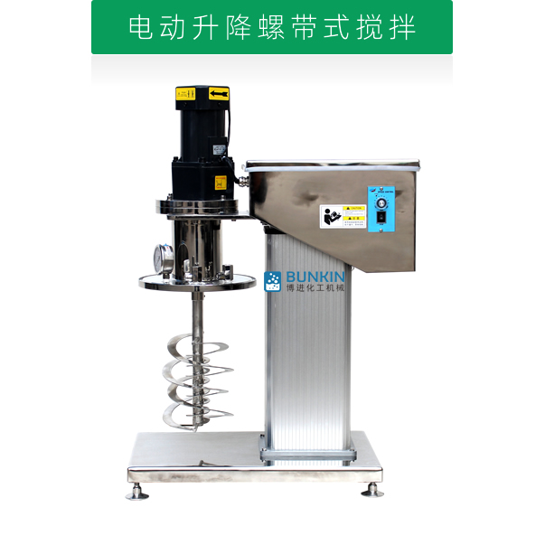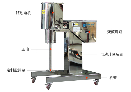 设备带有全不锈钢电动升降机构,能够快速升降和固定;桨叶采用内六角螺栓与主轴固定,能够方便快速拆卸更换,清洗容易;带有夹桶装置,可以快速将搅拌桶固定,防止桶在工作中发生位移造成安全事故。