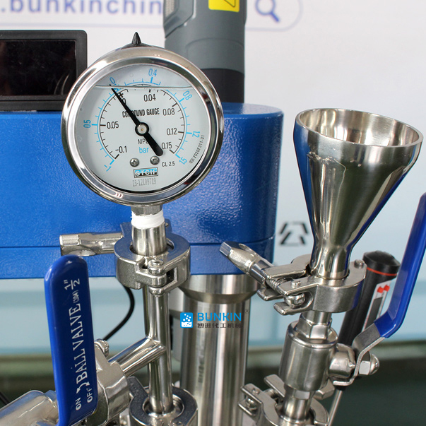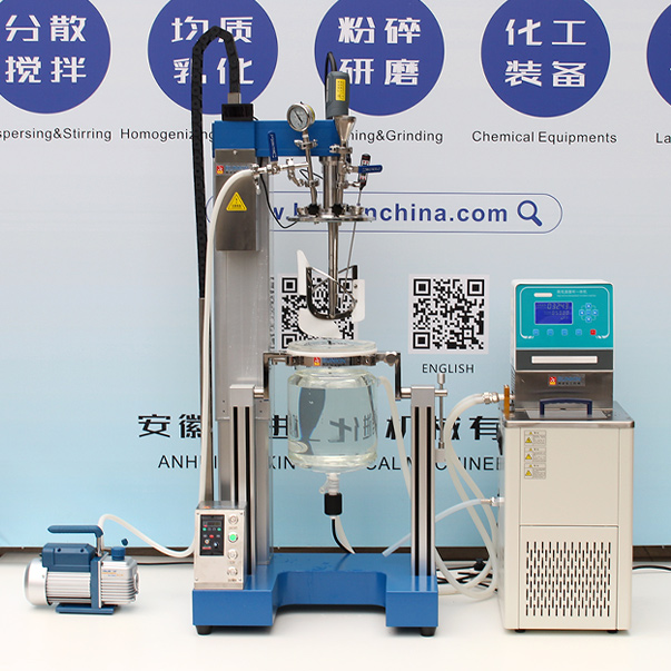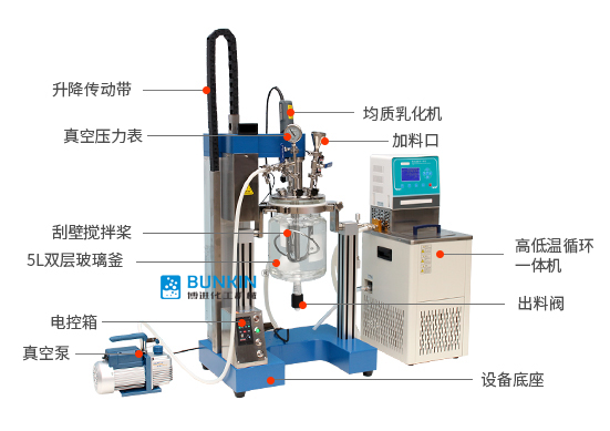 本机均质乳化裝置可直达釜底,可利用乳化头內循环乳化。利用高速乳化裝置,由转子高速旋转带 来高剪切力,使物料在定转子狭窄的间隙中发生高频剪切、挤压、均质、撞击等综合作用,可使两 相迅速融合,乳化,粒径变窄,颗粒更均匀。搭配慢速刮边的作用,刮壁板受到物料的阻力贴切在 釜壁作圆周运动,并将粘附在容器壁的物料推向容器中心区域,同时物料在搅拌桨的作用下完成宏 观上的混合,使物料得到充分换热和均匀混合。在搅拌物料的同时,通过夹层注入循环的热溶液或 冷却液,对釜内的物料进行恒温的加热或制冷。物料进行加热反应时,在真空条件下可以提高蒸发效 率(需连接真空装置),溶媒蒸汽经玻璃冷凝盘管时冷却成液体(需连接冷却装置),可回流到釜内,也 可通过回流弯头下部阀口进行回收。反应完毕,物料可从釜底的侧出料口放出。