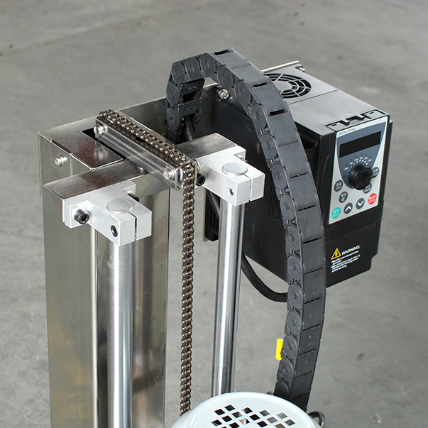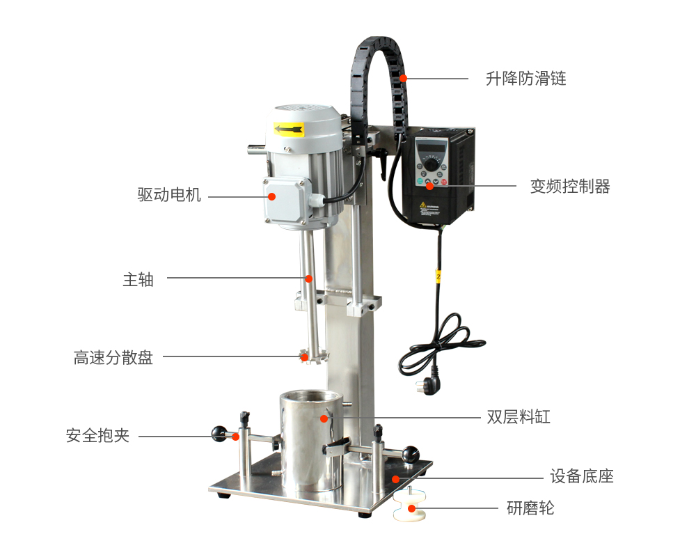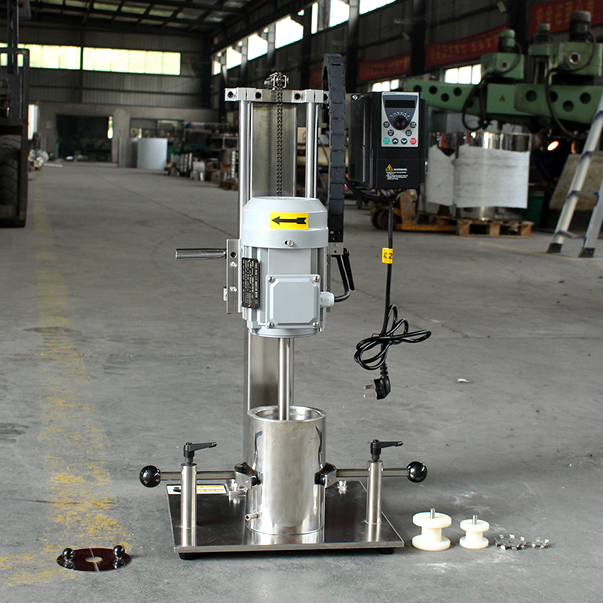 设备带有锁紧及升降手柄,能够快速升降和固定;分散盘采用内六角螺栓与主轴固定,能够方便快速拆卸更换,清洗容易;带有夹桶装置,可以快速将搅拌桶固定,防止桶在工作中发生位移造成安全事故。
