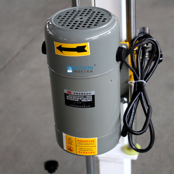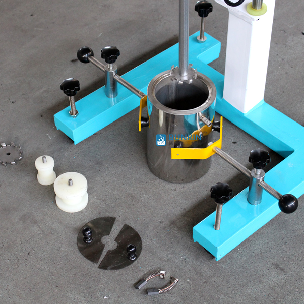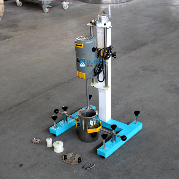 设备带有锁紧及升降手柄,能够快速升降和固定;分散盘采用内六角螺栓与主轴固定,能够方便快速拆卸更换,清洗容易;带有夹桶装置,可以快速将搅拌桶固定,防止桶在工作中发生位移造成安全事故。