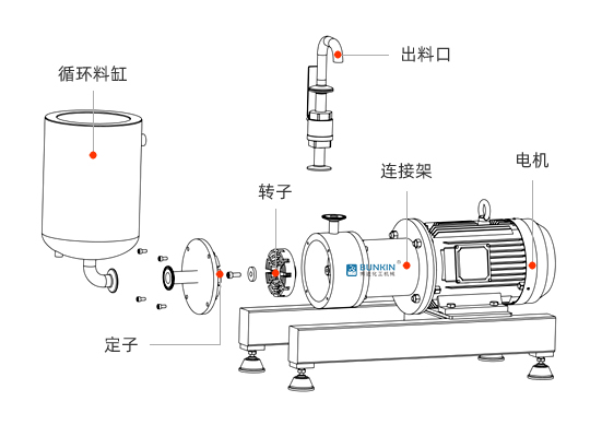 实验室乳化泵采用卧式结构;在狭长的工作腔内装有一组或多组转定子,转定子对耦精密配合;由电机带动中间轴进行高速运转,转定子形成真空,物料从双层料桶进口被吸入转定子腔内,强大动能使转子产生极高的线速度,使物料在转、定子间隙之间经过强烈的撞击、破 碎、离心挤、液层摩擦、强力剪切之后泵送出去,物料从出口流出并进入单/双层料桶循环,从而使不相溶的固相、液相、气相等多种介质在瞬间均匀精细、分散乳化,使产品达到稳定的高品质产品。