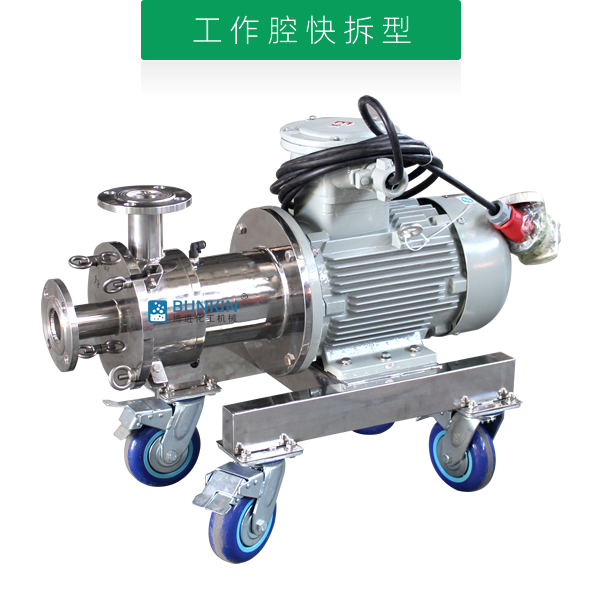 单级乳化泵是连续式生产或循环处理精细物料的均质乳化设备。电机带动转子高速运转,通过机械外力作用的方法使液-液、固-液物料颗粒粒径变窄,使一种相均匀分布到另一种或多种相中,达到细化均质、分散乳化效果,从而形成稳定的乳状液的状态。单级乳化泵前级可配置送料泵,对中高粘度物料有一定的适用性。设备噪音低,运转平稳,无死角,物料强制性通过分散、剪切的作用。具有短距离、低扬程输送功能。【产品专利号:ZL201820997023.8】