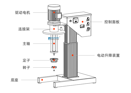 实验室电动升降乳化机强劲的马达进行高速旋转使转、定子之间形成真空,物料从转、定子上部和底部吸入。大动能使转子产生极高的线速度,使物料在转、定子间隙之间经过强烈的撞击、破碎、离心挤、液层摩擦、强力剪切之后飞射出去,在多种不同方向力的作用下,产生强大紊流。物料在适量乳化剂和成熟工艺下经过一定时间反复循环解聚、分散、均质、细化、剪切产生稳定乳状液。