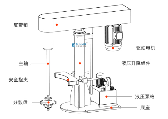设备通过油缸作为升降执行器,带控制阀控制分散机上升、停止、下降,操作简单,稳定性高;分散盘采用内六角螺栓与主轴固定,能够方便快速拆卸更换,清洗容易,且可以根据工艺情况更换不同的分散盘,实现分散效果;带有不同的抱夹方式(皮带、手摇、气动),可以快速将搅拌桶固定,防止桶在工作中发生位移造成安全事故。
