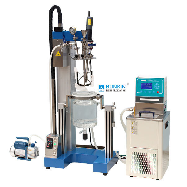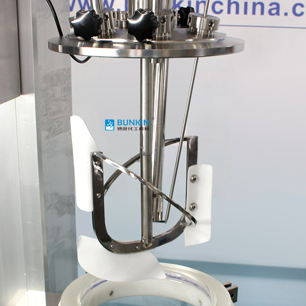 本机均质乳化裝置可直达釜底,可利用乳化头內循环乳化。利用高速乳化裝置,由转子高速旋转带 来高剪切力,使物料在定转子狭窄的间隙中发生高频剪切、挤压、均质、撞击等综合作用,可使两 相迅速融合,乳化,粒径变窄,颗粒更均匀。搭配慢速刮边的作用,刮壁板受到物料的阻力贴切在 釜壁作圆周运动,并将粘附在容器壁的物料推向容器中心区域,同时物料在搅拌桨的作用下完成宏 观上的混合,使物料得到充分换热和均匀混合。在搅拌物料的同时,通过夹层注入循环的热溶液或 冷却液,对釜内的物料进行恒温的加热或制冷。物料进行加热反应时,在真空条件下可以提高蒸发效 率(需连接真空装置),溶媒蒸汽经玻璃冷凝盘管时冷却成液体(需连接冷却装置),可回流到釜内,也 可通过回流弯头下部阀口进行回收。反应完毕,物料可从釜底的侧出料口放出。